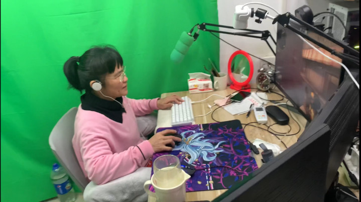 2022年2月,娟姨在简易绿幕前打游戏(受访者提供)