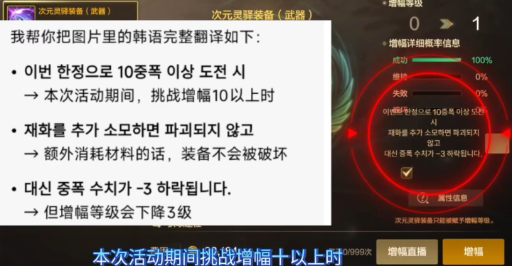 虽然说氪佬在这游戏那真的是无所不能的,但在增幅这方面却是不行,因为增幅不仅仅有增幅胚子的限制,而且增幅高等级失败还会直接碎掉。这也是让旭旭宝宝都服了,花费了巨大的代价武器还只是增幅13而已,这也是能看出增幅有多难了。而最近有玩家在体验服发现,这次增幅装备界面右边多出了一串韩文提示。而根据翻译这竟然是增幅保护功能,就是在活动期间额外消耗材料增幅失败不会碎掉,只是增幅等级下降3级而已。而这对于普通玩家来说可能影响不大,但对于不差钱的土豪大佬来说这影响可就非常大了。