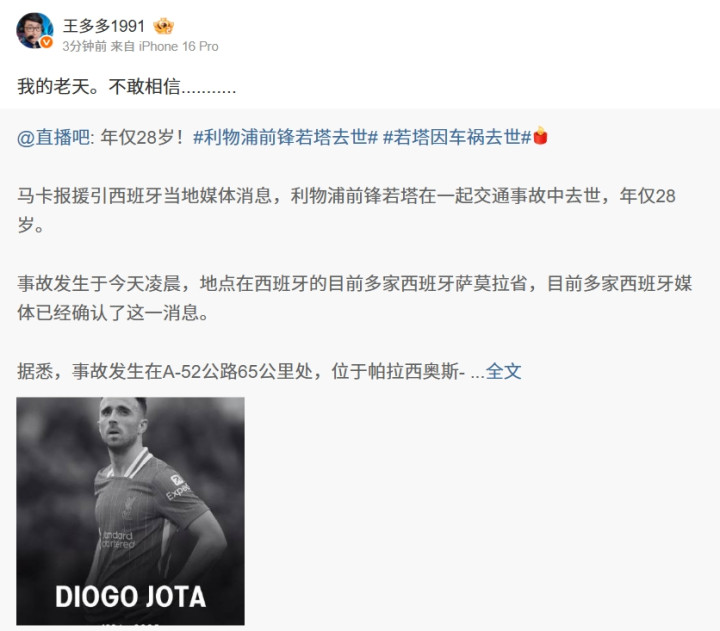 RIP! 王多多看若塔因车祸去世: 我的老天。不敢相信...........