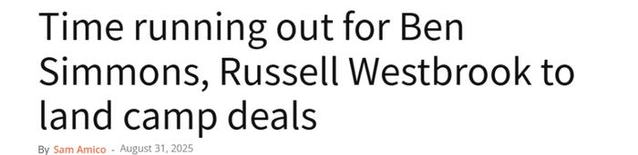 然而,西蒙斯和威斯布鲁克都希望获得比老将底薪更高的薪资。或许正因如此,他们才会在训练营开启前仍无人问津。