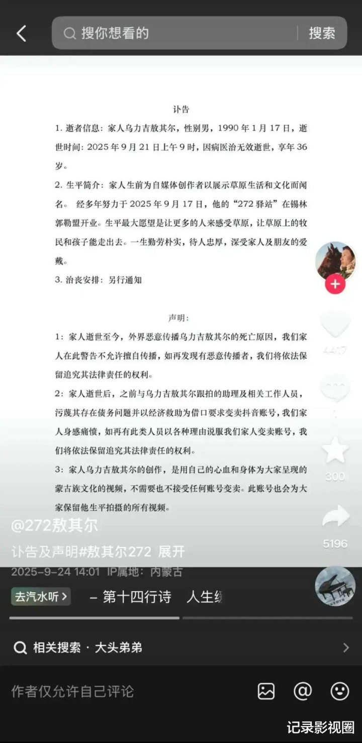 这场突如其来的告别,让“网红”二字褪去光环显露出职业的沉重底色。当网友整理敖其尔六年发布的417条视频时发现,他反复提及的“草原智慧”其实早有预警——“牧人不会让同一匹马连续跑三个敖特尔(牧场),因为再强壮的骏马也需要在溪水边低头饮水”。如今回看这些充满哲理的蒙古谚语,恍若一场跨越时空的生命对话。在流量与健康的天平上,这个总劝别人“像牧草一样生长”的草原之子,终究没能给自己留下足够的生长周期。
