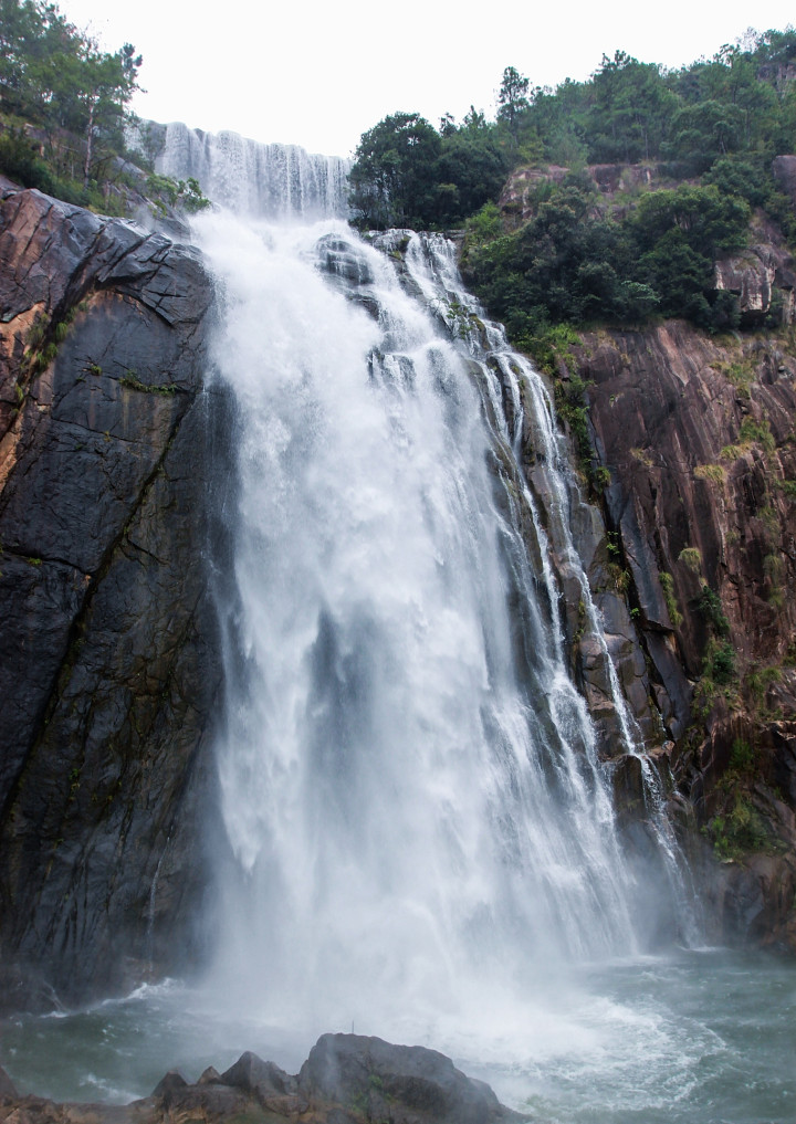 爬过三分之一,突然听见“轰隆隆”的水声,拐过山弯,瀑布从100多米高的崖顶砸下来,像条白绸子摔在石头上,水花溅得老远,站在五米外都能感觉到脸上的凉。旁边巨石刻着“新丰江之源”,红漆透着沧桑——向导说这水流进东江,一路到香港。