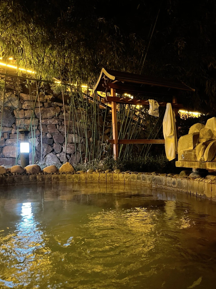 泡进40多度的温泉里,抬头就是绿树,阳光透过树叶洒在水面,波光粼粼的。水裹着身体,暖得刚好,听说含氟和硅,泡半小时,浑身骨头都松了。晚上来泡更妙:没有路灯,只有池边的小灯笼亮着,抬头能看见星星,多得像撒了把碎钻,虫鸣“叽叽喳喳”的,比北京的夜景多了份野趣。