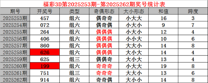 上期回顾:福利彩票3D第2025262期开奖结果914。奖号:奇奇偶、大小小,和值14,跨度8。