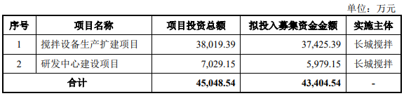 长城搅拌原拟公开发行不超过4,500.00万股,且占发行后总股本的比例不低于25%。本次发行不安排公司股东公开发售股份。公司原拟募资43,404.54万元,用于搅拌设备生产扩建项目和研发中心建设项目。