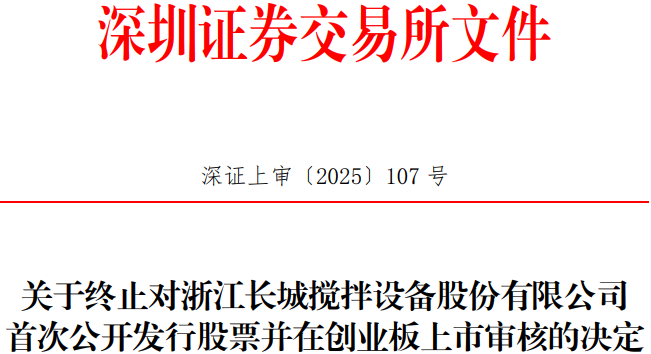 日前,长城搅拌向深交所提交了《关于撤回浙江长城搅拌设备股份有限公司首次公开发行股票并在创业板上市申请文件的申请》,保荐人向深交所提交了《东方证券股份有限公司关于撤回浙江长城搅拌设备股份有限公司首次公开发行股票并在创业板上市申请文件的申请》。根据《深圳证券交易所股票发行上市审核规则(2024年修订)》第六十二条的有关规定,深交所决定终止对长城搅拌首次公开发行股票并在创业板上市的审核。