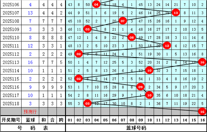 蓝球分析:第2025118期开出蓝球03,最近10期蓝球号码遗漏期数分别为:52期、4期、18期、13期、8期、20期、2期、54期、2期、8期,第2025119期蓝球注意04-16段出号,重点关注1路蓝球。第2025109期参考蓝球:16。