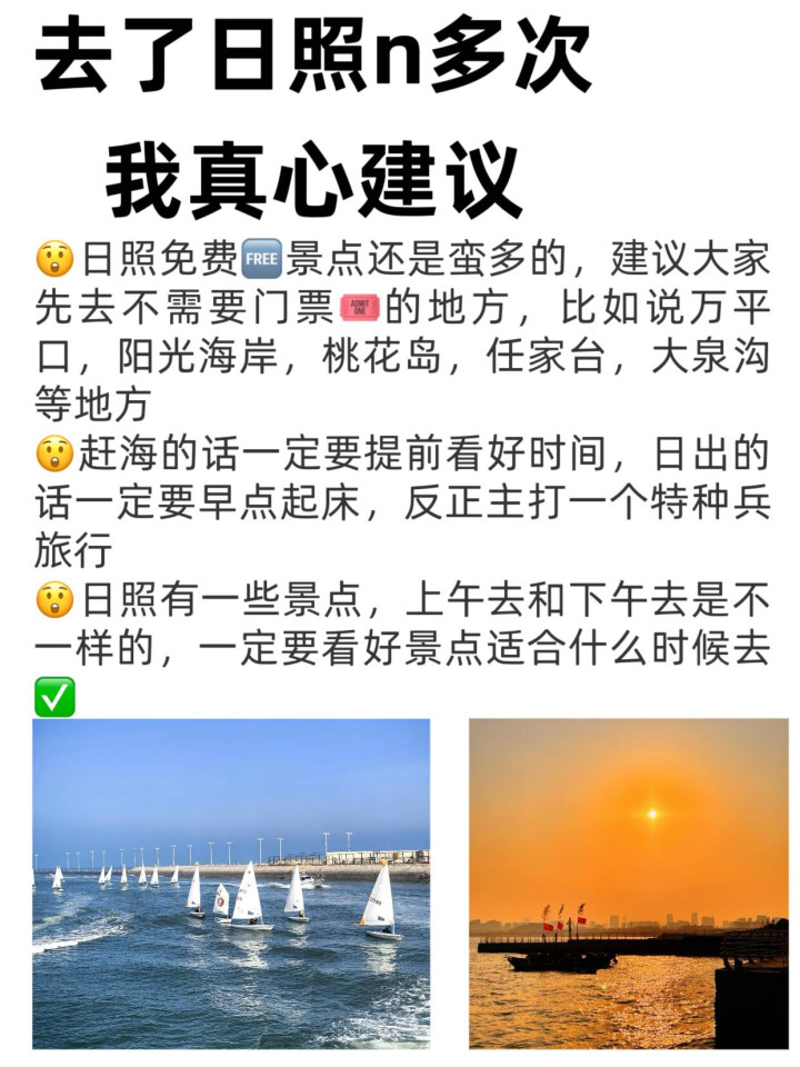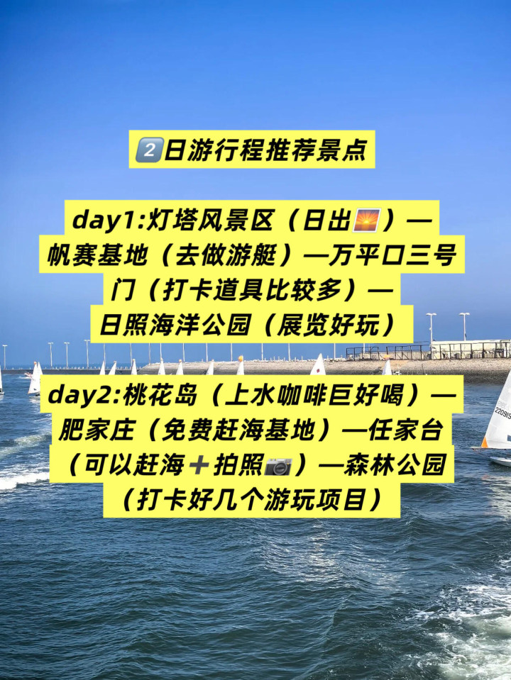 day1:灯塔风景区(日出🌅)—帆赛基地(去做游艇)—万平口三号门(打卡道具比较多)—日照海洋公园(展览好玩)