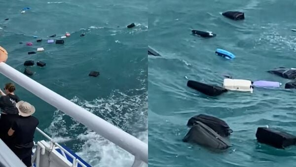 多名乘客将相关视频上传至社交平台。其中一段视频中,乘客们站在甲板上,远远望向随波逐流的行李箱。在另一段视频中,坐在客舱的人们集体傻眼,盯着窗外的一件件漂流的家当。