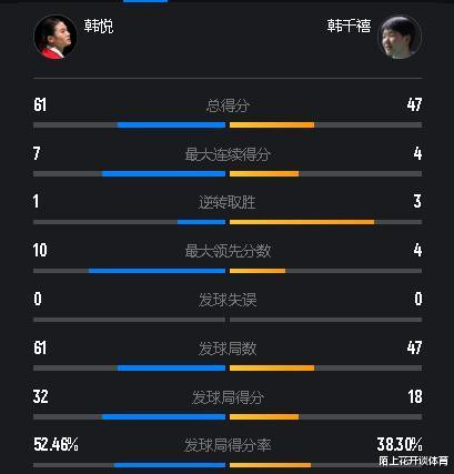 决胜局韩悦延续了火热的手感,一上来就用高质量的四方拉吊,限制住了韩千禧的进攻,在2平之后直接轰出了一波6-0的得分高潮,确立起了8-2的优势,虽然韩千禧一直在追分,但韩悦还是带着11-6的优势交换场地,易边再战,韩千禧失误频频出现,韩悦一鼓作气以21-11锁定胜局。