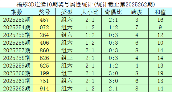 开奖回顾:福彩3D第2025262期奖号为914。奖号形态为组六,大小形态为大小小,奇偶形态为奇奇偶,和值为14,跨度为8。