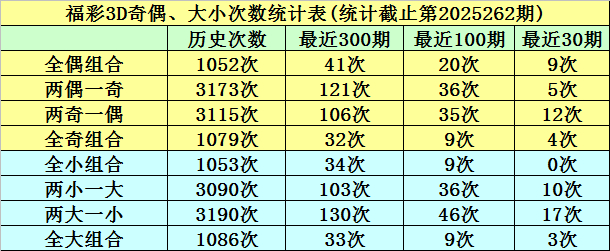 在前10期开奖中,全小组合出现0次,两小一大组合出现4次,两大一小组合出现6次,全大组合出现0次,本期预计开出两大一小组合。
