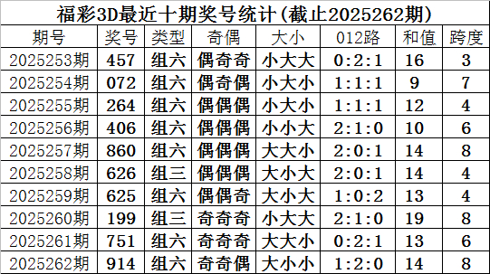 开奖回顾:福彩3D第2025262期奖号为914,奖号形态为:组六、大小小、1:2:0、奇奇偶。