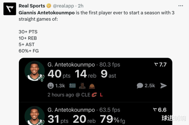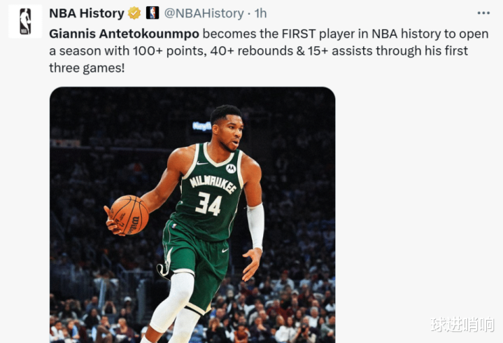 字母哥如此神奇的表现,也是其开赛至今夸张表现的缩影,新赛季至今3场比赛,字母哥一共砍下108分48篮板21助攻,场均36分16板7助。