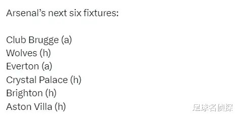 阿森纳未来6场比赛:客战布鲁日、主战狼队、客战埃弗顿、主战水晶宫、主战布莱顿、主战维拉。